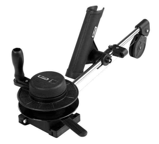 Scotty 1050 Depthmaster. Scottys manuella riggar tillverkas med ett antal exklusiva egenskaper som den horisontella designen som gör att man får bättre kraft och enkelt kan sköta riggen med en hand. Depthmaster är en mycket bra allroundrigg med 57cm lång rostfri bom. Den tar in 30cm per vevtag och levereras med 60 m rostfri wire som tål 75kg. Depthmaster är även utrustad med kopplingsbroms som ger med sig om lodet fastnar i bottnen för att undvika att man förlorar utrustning. Levereras med Rodmaster II spöhållare och linutlösare.