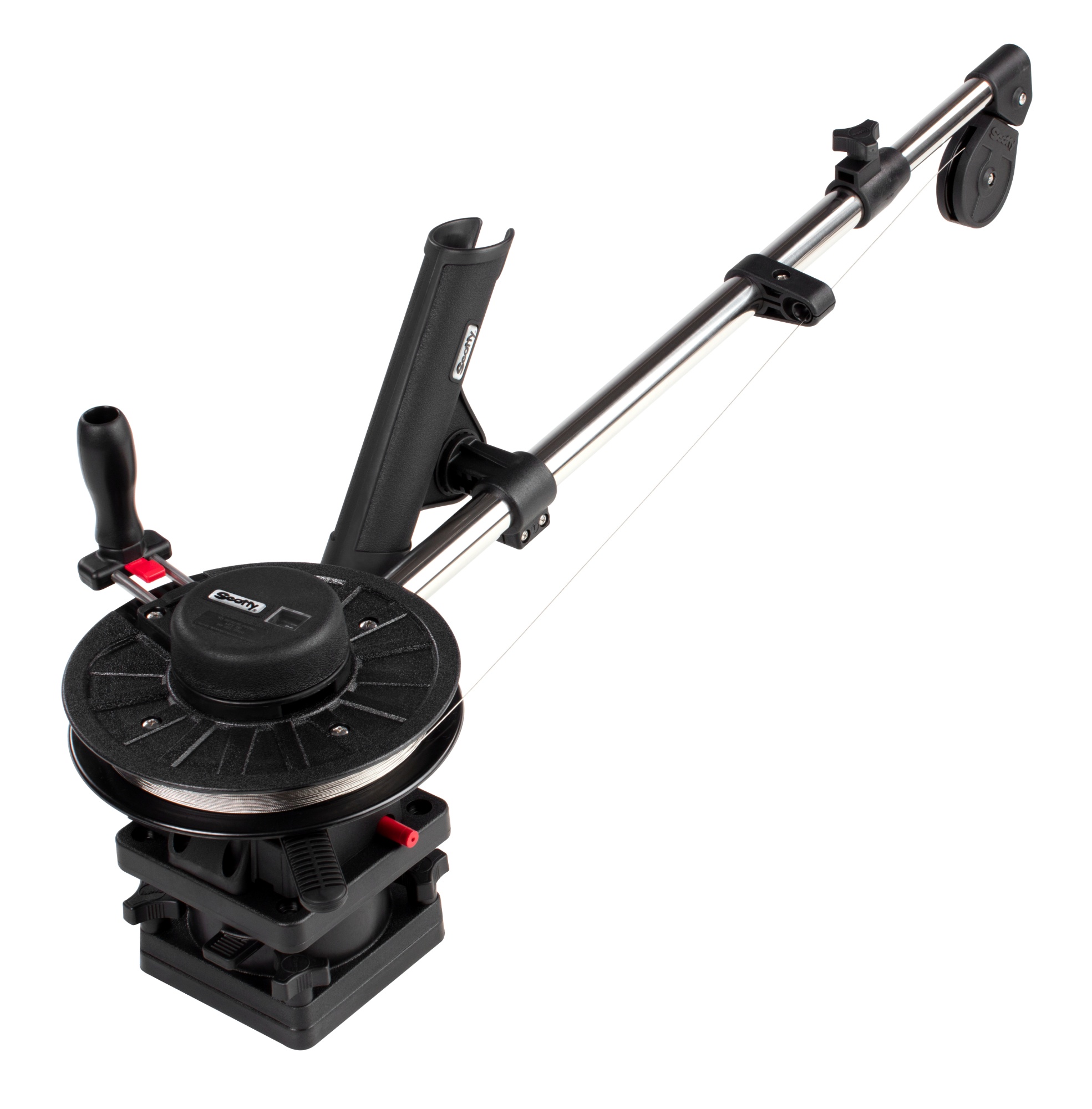 Scotty 1091 Longarm. Scottys manuella riggar tillverkas med ett antal exklusiva egenskaper som den horisontella designen som gör att man får bättre kraft och enkelt kan sköta riggen med en hand. Longarm är en mycket bra allroundrigg med en stark teleskopisk rostfri bom 90-150cm som har en diameter på 3cm. Den har High Speed spole som tar in 60cm per vevtag och levereras med 60 m rostfri wire som tål 75kg. Longarm är även utrustad med kopplingsbroms som ger med sig om lodet fastnar i bottnen för att undvika att man förlorar utrustning. Levereras med ett 10 positioners roterbart fäste, Rodmaster II spöhållare och linutlösare.