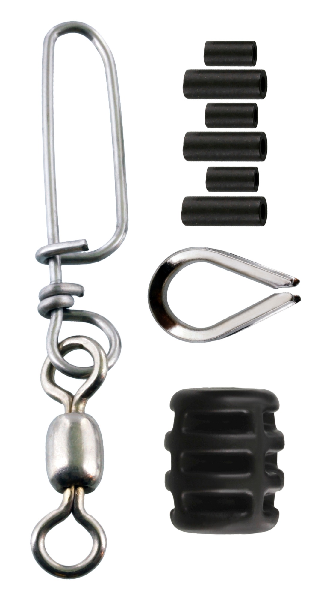 Scotty 1153 Terminal Kit. Kit för koppling mellan trollingwire och lod, innehåller rostfri Coastlock Snap med lekande, stötdämpare, rostfritt wireskydd (kaus) och krymphylsor i svarteloxerad mässing.