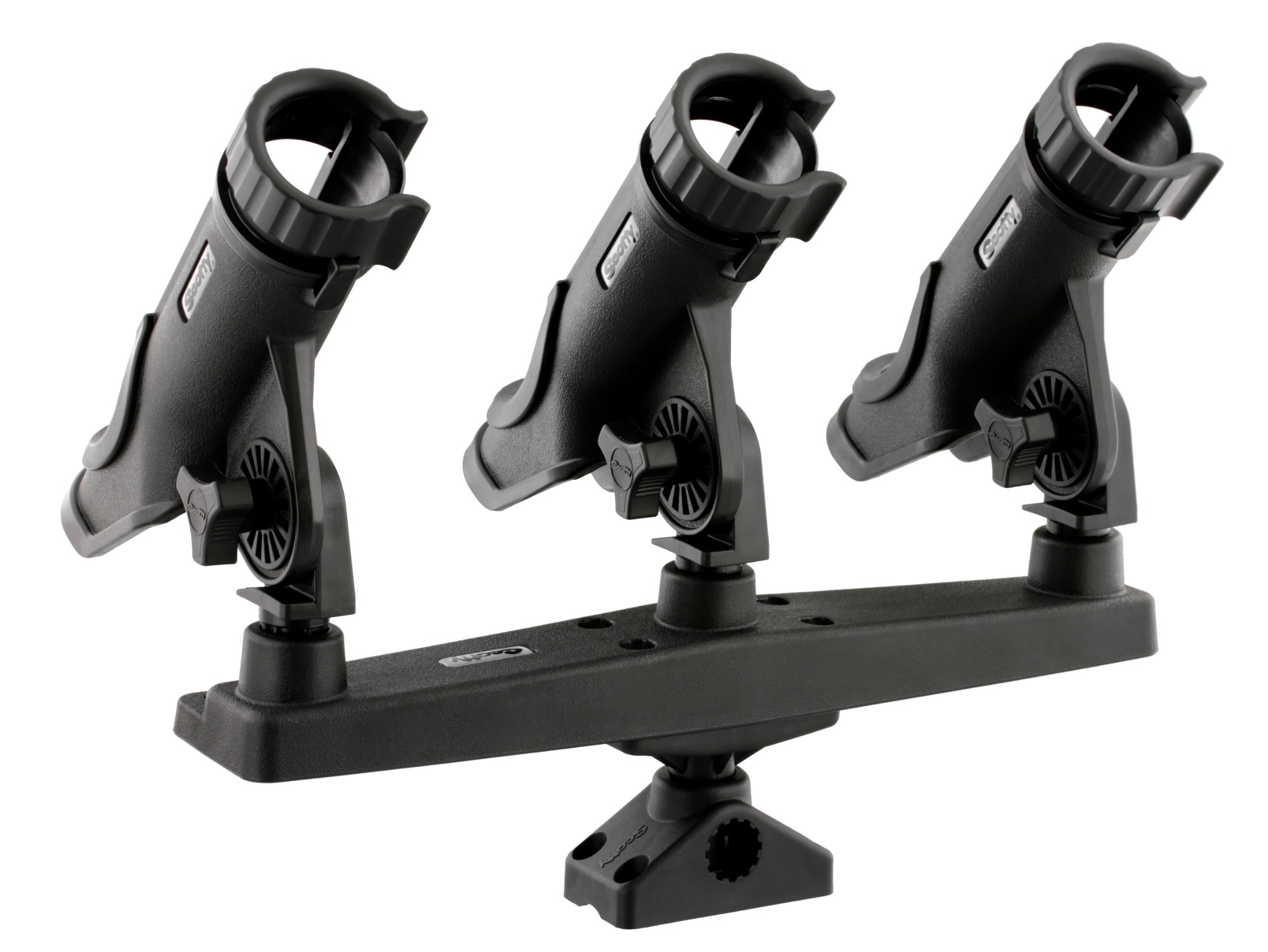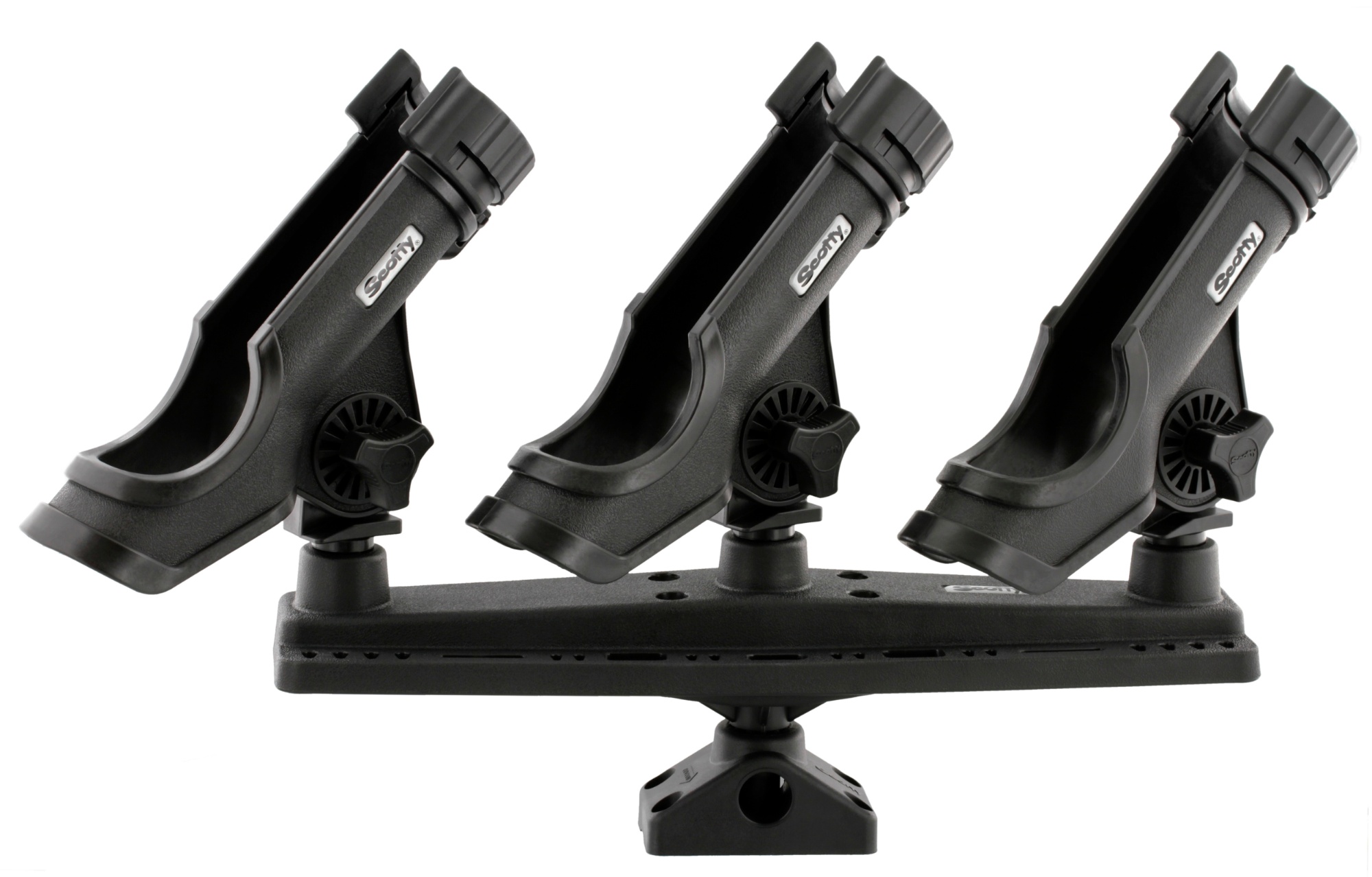 Scotty 256 Triple Rod Holder. Spöhållare med 3 styck Scotty 230BK Powerlock, Scotty’s mest populära spöhållare tillverkad av fiberförstärkt nylon. Powerlock kan tack vare den öppna designen användas tillsammans med i stort sett vilket spö som helst och har en främre låsring som även fungerar som transportsäkring. Triple Rod Holder levereras med Scotty 241 som kan roteras 360° och är försedd med flera hållare för verktyg och beten.