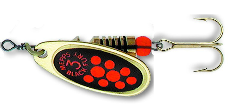 Mepps Black Fury. Black Fury har ett rykte om sig att producera även under tuffare förhållanden t.ex. när vattnet är kristallklart, när det är mycket vegetation eller nattetid. Black Fury spinner lite närmare kroppen än ex. Mepps Aglia. Vikt 6,5g. Färg Guld med orange prickar.