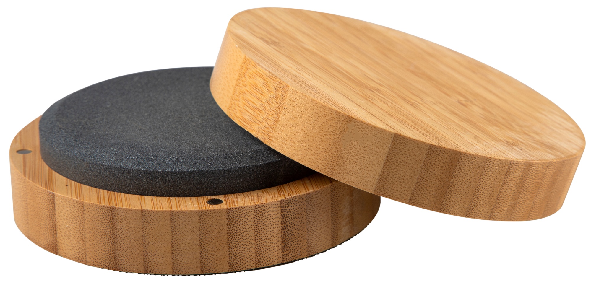 IFISH Bryne för yxa och kniv, levereras i praktiskt etui av bambu. Locket har magnetlåsning och etuiet fungerar som hållare under användning. Tvåsidigt med två olika kornstorlekar.