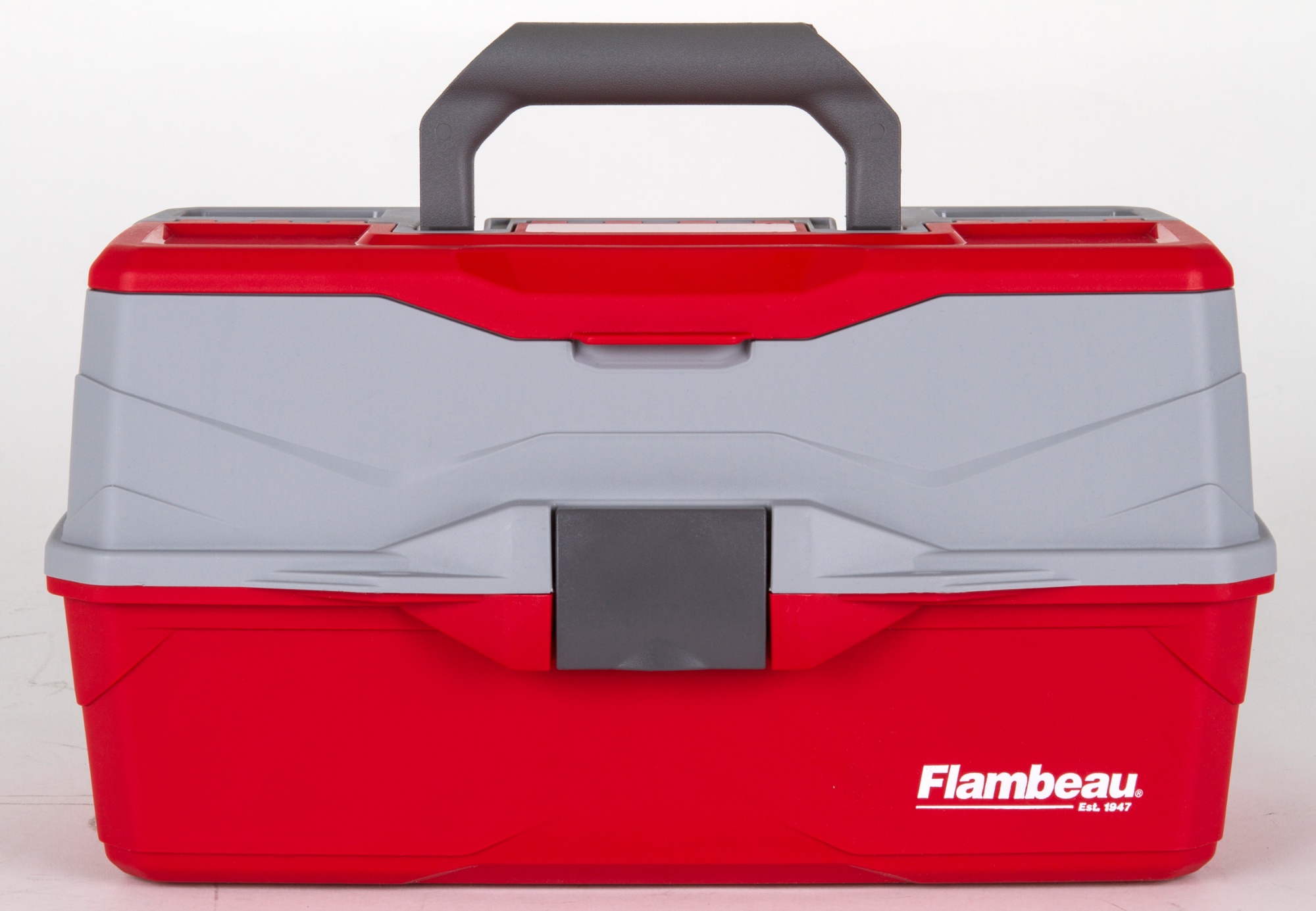 Flambeau Classic 6383TB. Klassisk draglåda tillverkad i USA av slagtålig plast med en unik konstruktion i locket som gör lådan i det närmaste vattentät. 6383TB har ett förvaringsfack i locket och tre hyllplan med 32 fack (13 flyttbara avskiljare). Storlek 40 x 22 x 21cm. Färg Röd-Grå.