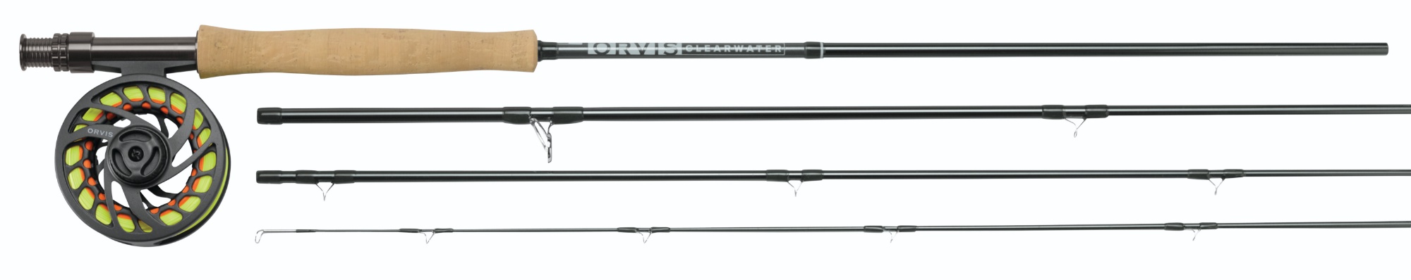 Orvis Clearwater 905-4 Outfit. Komplett flugfiskeset med Clearwater 4-delat grafitspö i kombination med Clearwater storspolerulle, fluglina och backing. Levereras i skyddande tub av cordura. Längd 9', 270cm. Linklass 5.
