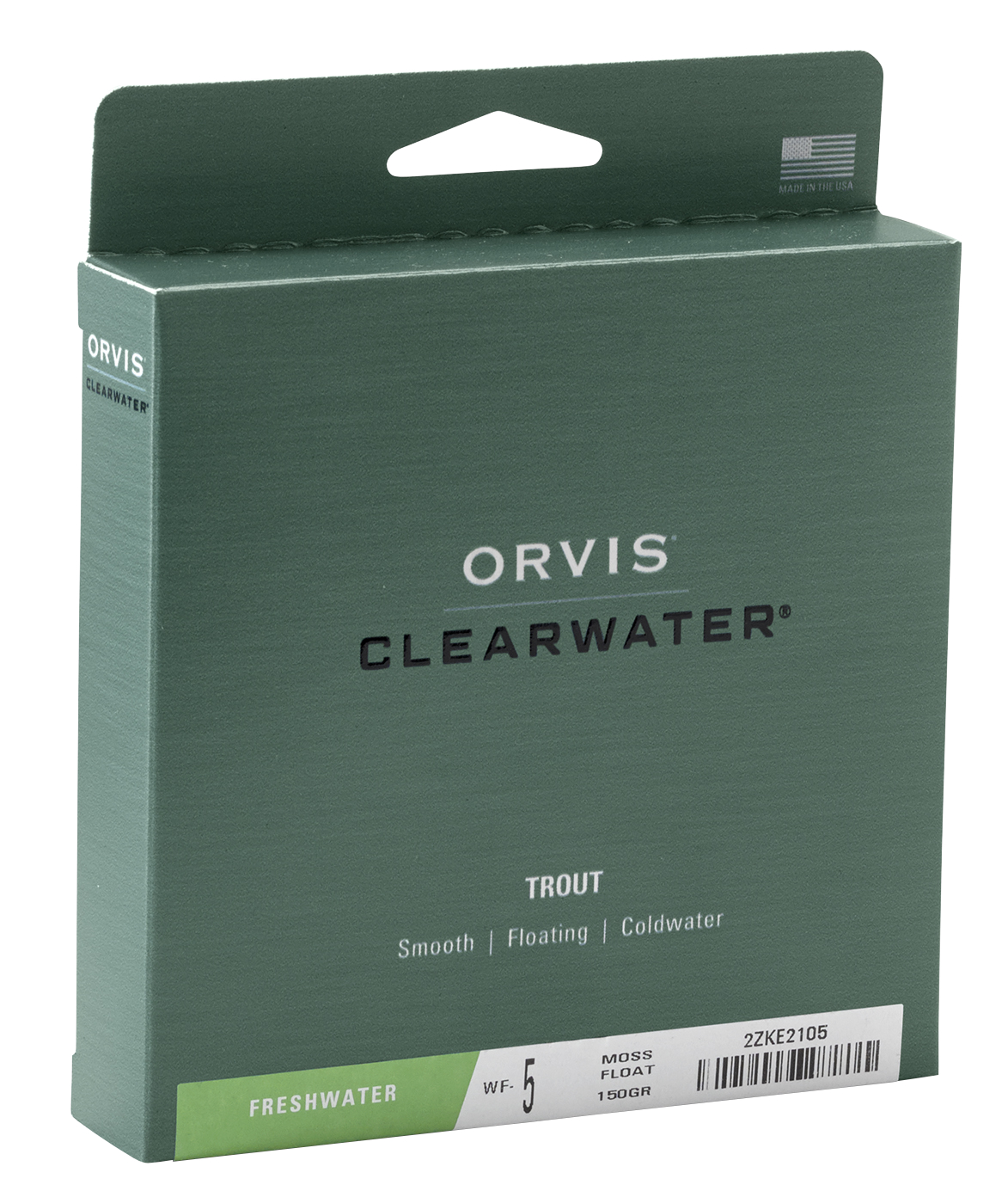 Orvis Clearwater Trout WF4F. Clearwater är en flytande allroundlina som snabbt och effektivt laddar moderna grafitspön, den har en ögla i främre änden som underlättar vid byte av tafs. Indikering på linan gör det lättare att se vad man har på rullen. Totallängd 23m. Klumplängd 10m. Färg Mossgrön. Linklass 4.
