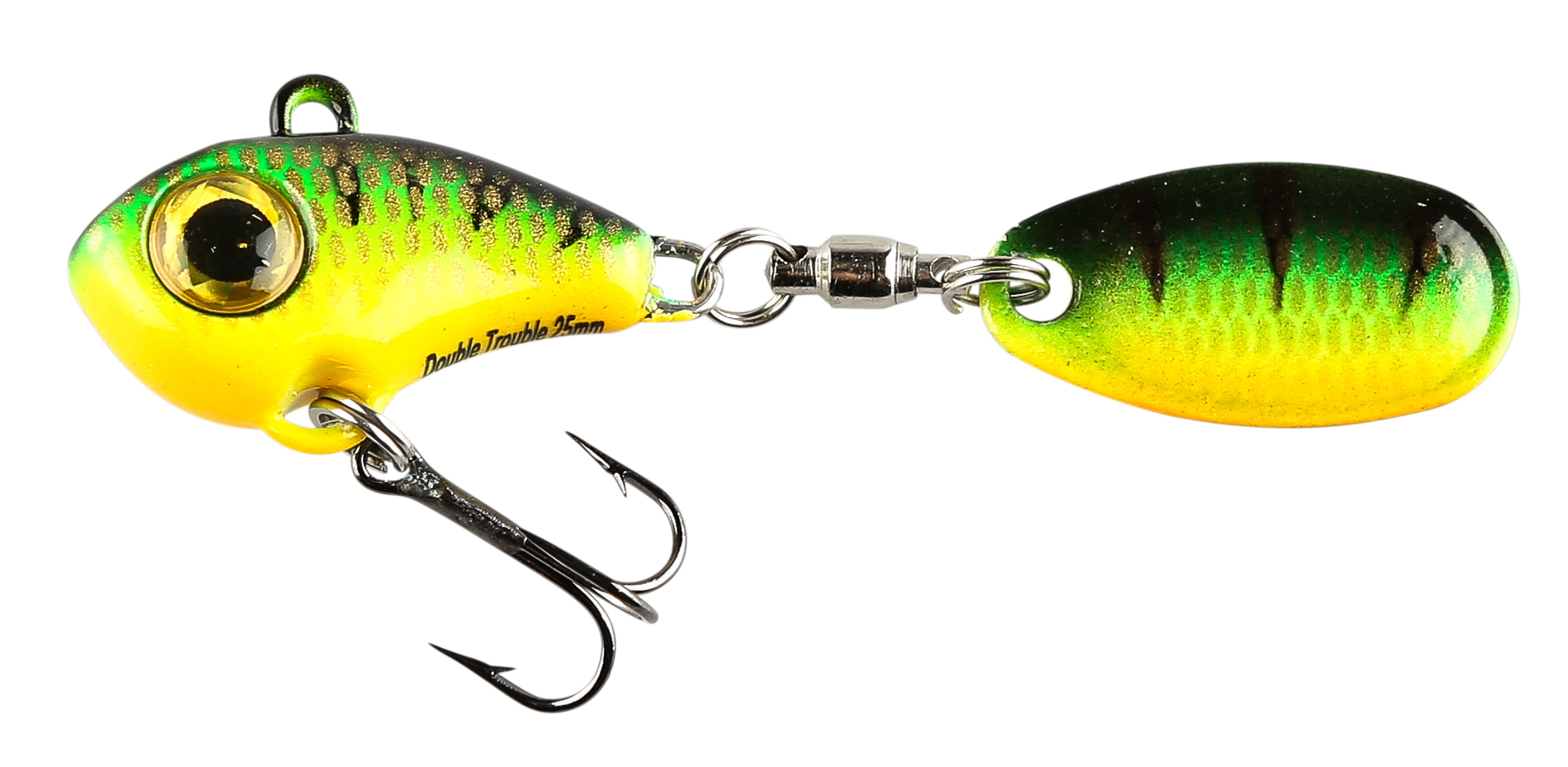 IFISH Double Trouble 25mm. Double Trouble har en kompakt kropp som gör att man kan kasta den långt och därmed fiska av stora ytor, den har även ett spinnarblad som skapar vibrationer och lockar även trögare fisk till hugg. Double Trouble passar därför bra även när det är kallt i vattnet och är perfekt för isfiske. Tillverkad av zink. Längd 25mm. Vikt 8g. Färg Perch
