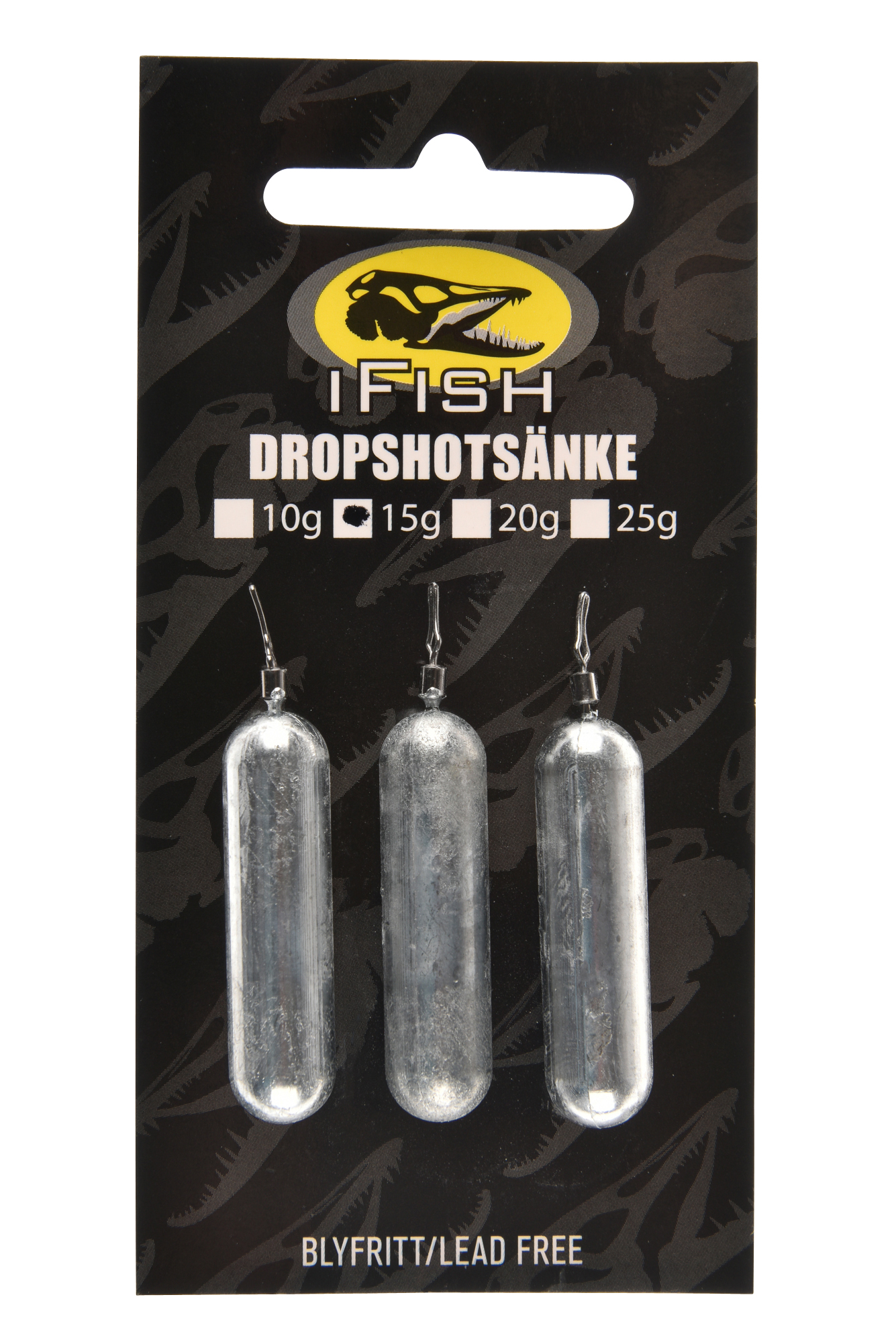 IFISH Dropshotsänke Blyfritt 15g. Dropshotsänke av zink. Dropshotsänken används vid långsamt jiggfiske nära botten där man använder en nylontafs på ca 1-2 meter mellan sänket och flätlinan. Vikt 15g. 3 styck per förpackning.