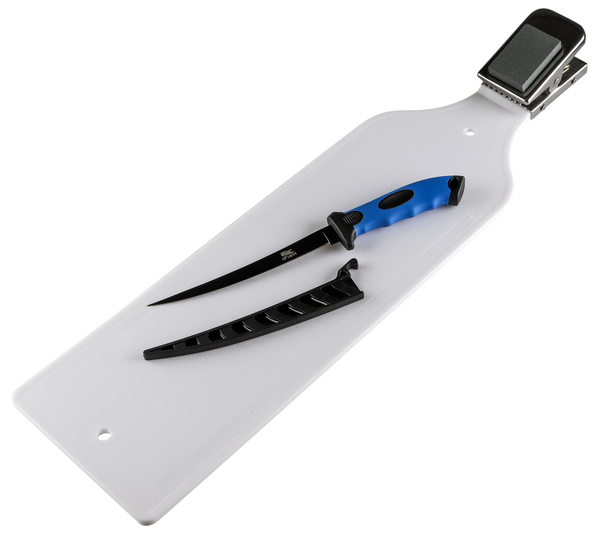 IFISH Filé-Kit 7''. Filébräda i plast med klämma i kombination med filékniv med blad av rostfritt stål och med greppvänligt handtag i TPR. Plastslida som är lätt att hålla ren. 7’’ (17,5cm) långt blad. Totallängd 30cm.