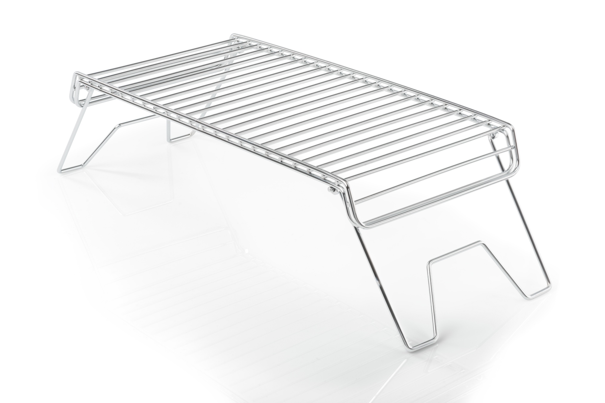 GSI Folding Campfire Grill – Rejält grillgaller i rostfritt stål. Vikbara ben för smidig transport och förvaring. Kant på långsidorna förhindrar att grytor och stekpannor glider av gallret. Vikt: 990g, Mått ihopvikt: 4,5 x 21,1 x 44,3cm, Material: Rostfritt stål