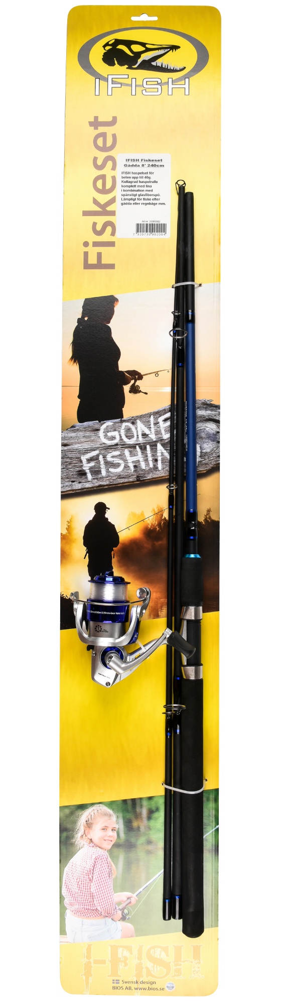 IFISH Gädda, haspelset för fiske efter gädda, regnbåge etc. 8', 240cm långt 3-delat haspelspö i glasfiber med EVA-handtag och slitstarka dynafloringar. I kombination med kullagrad haspelrulle med påspolad nylonlina. Lämpligt för beten upp till 40g