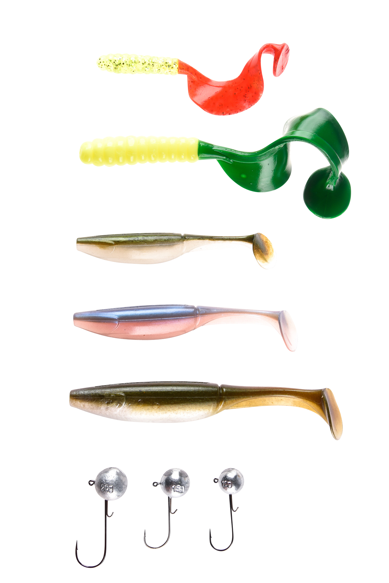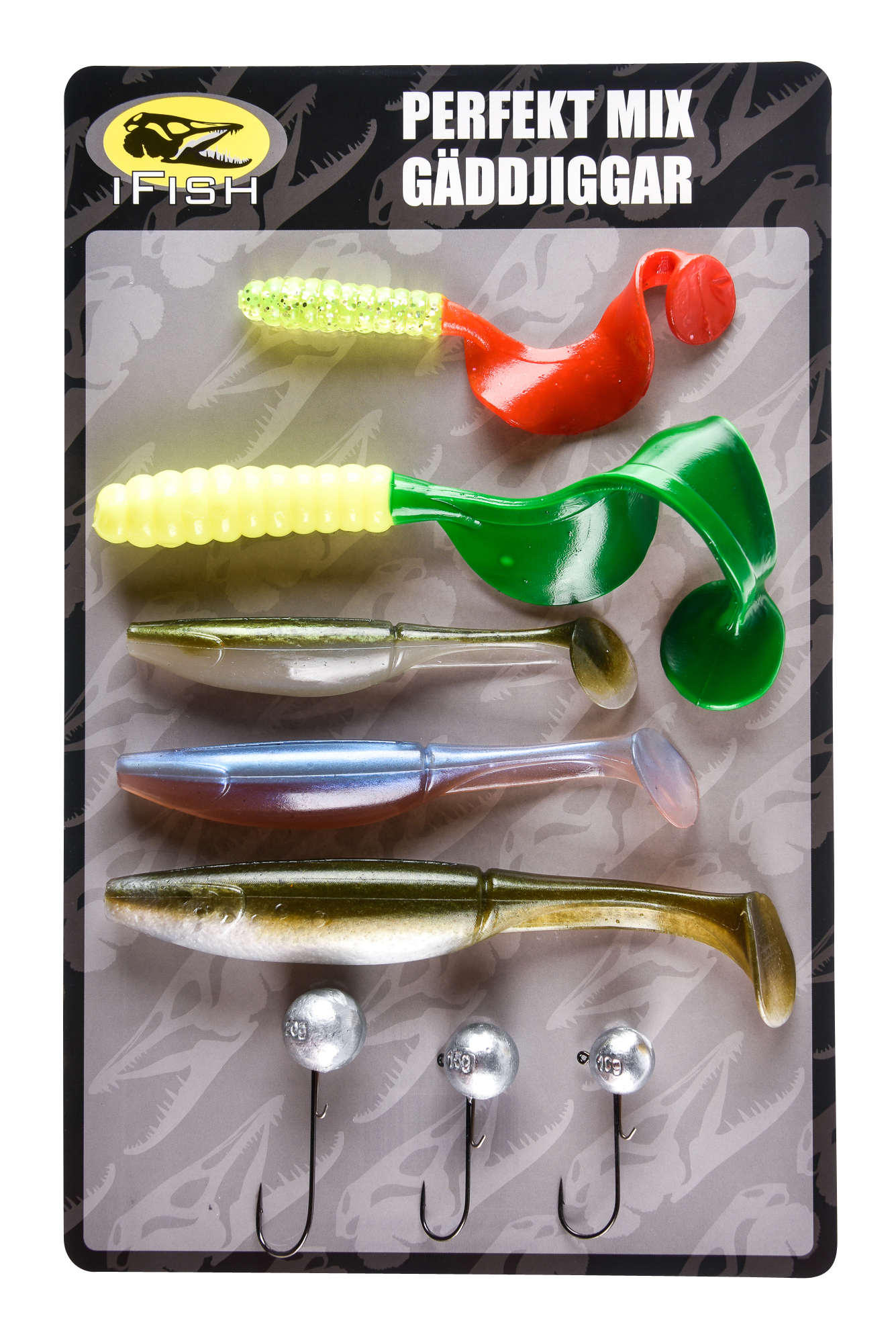 IFISH Perfekt Mix Gäddjiggar. Innehåller 5 olika gummijiggar och 3 blyfria jiggskallar för abborrfiske.