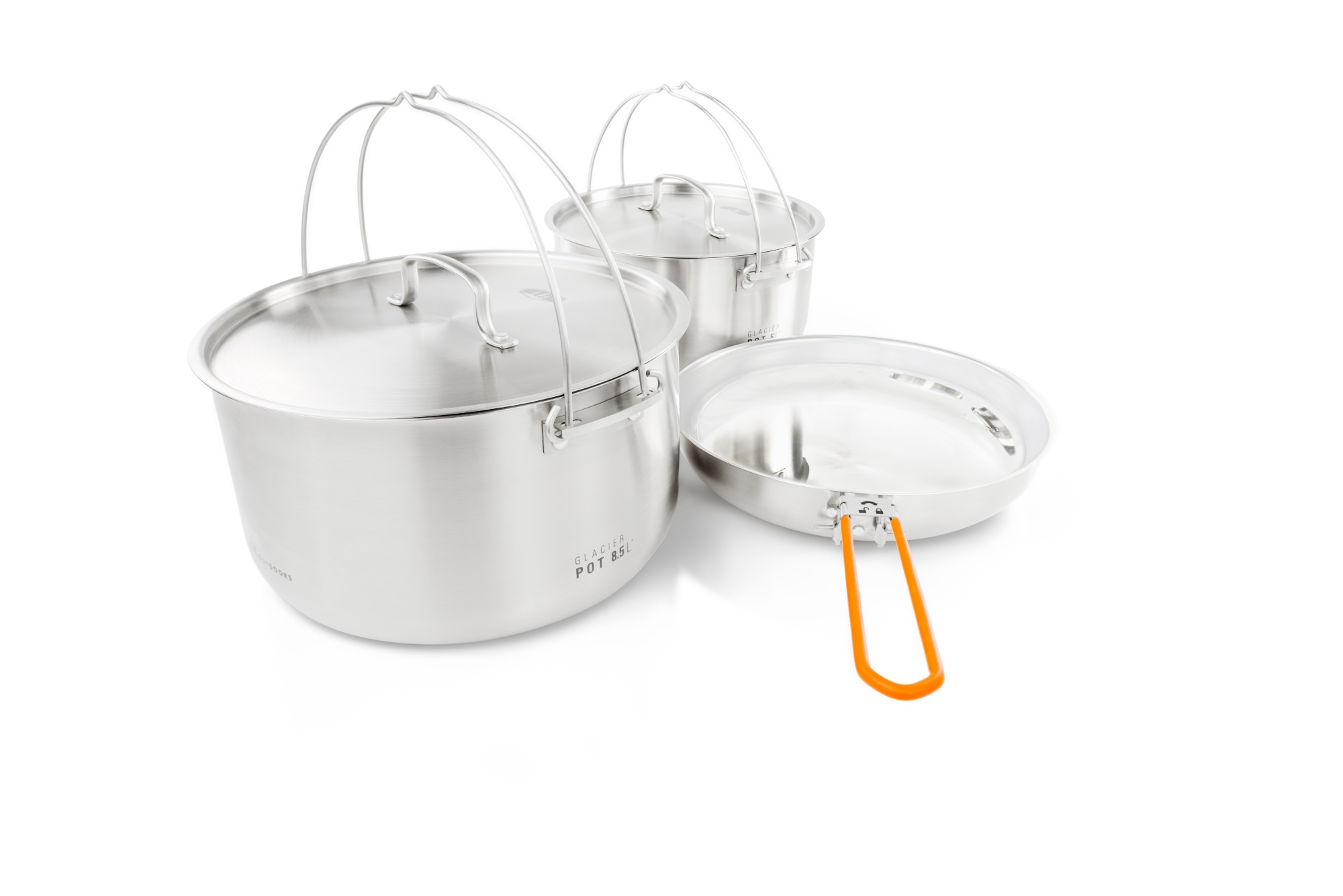 GSI Glacier Stainless Troop Cookset – Komplett set för en större grupp som vill laga mat över öppen eld. Två kastruller, 5 och 8,5 L med lock samt en 10’’ stekpanna med vikbart handtag. Kastrullerna har byglar för att enkelt kunna hängas över elden. Allt kan packas i den största kastrullen. Packpåse i mesh ingår också. Vikt: 3809g, Volym: 5 + 8,5 liter, Mått: 21,6 x 29,8 x 32,1cm, Material: Rostfritt stål