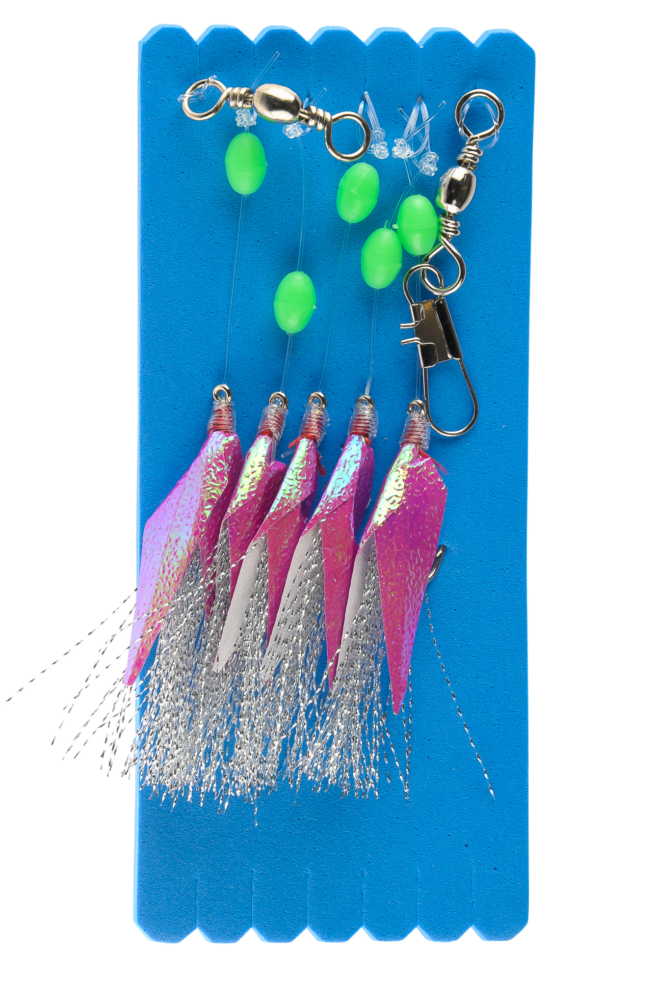IFISH Glittervinge 2/0 Röd. Häckla med fem upphängare som levereras på praktisk foam där häcklan kan förvaras för att undvika trassel i redskapslådan. Krokstorlek 2/0. Lämplig för fiske efter Makrill mm.