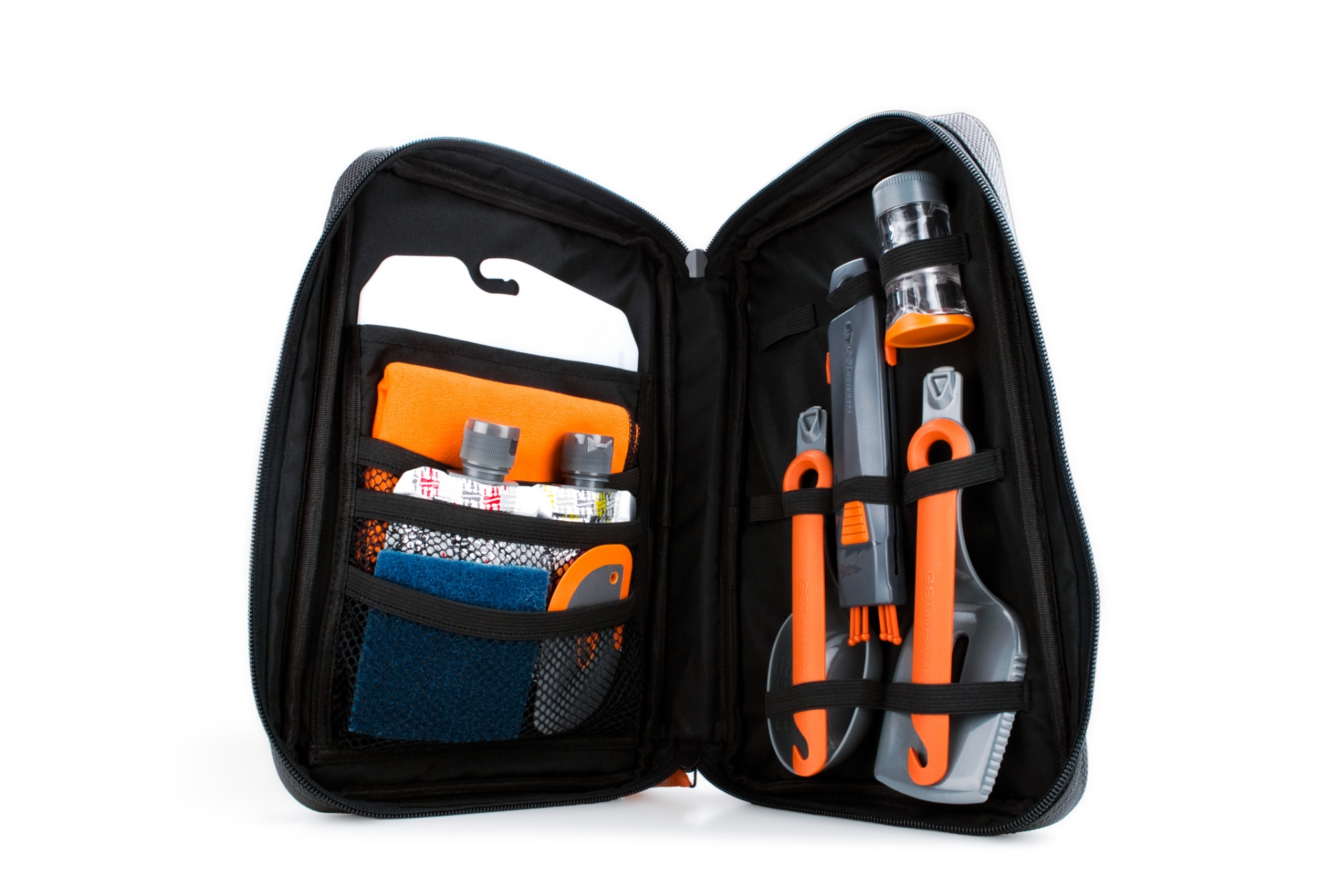 GSI Gourmet Kitchen 11 - Komplett kit med verktyg för matlagning i det fria. Smidiga och lätta verktyg som är genialiskt ihopfällbara, behållare för t ex olja och diskmedel, disksvamp, skärbräda, handduk och smidig förvaringsväska gör det hela till en nödvändighet för alla utematlagare. Vikt: 521g Mått: 29,7 x 19,6 x 5,1cm. Innehåll: Pivot Spoon (ihopvikbar slev), kniv, Pivot Spatula (ihopvikbar stekspade), ihopfällbar visp, Compact Scraper (kompakt slickepott), vattentät kryddbehållare, 2 mjuka små flaskor, disksvamp, skärbräda, handduk och en smidig förvaringsväska.