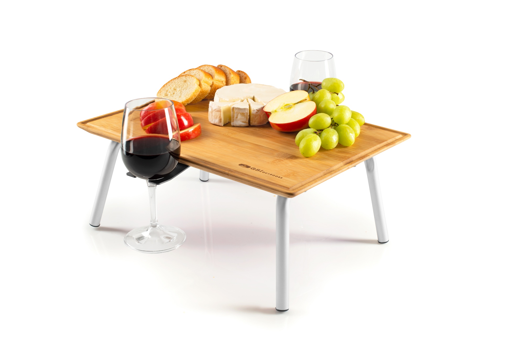 GSI Rakau Picnic Table - Smidigt minibord med skiva av bambu. Två snillrika hållare för vinglas ser till att du slipper spill. Vikbara ben i aluminium. Bordsskivan mäter 38x26cm, och bordet är uppfällt 16,5cm högt. Vikt: 1300g