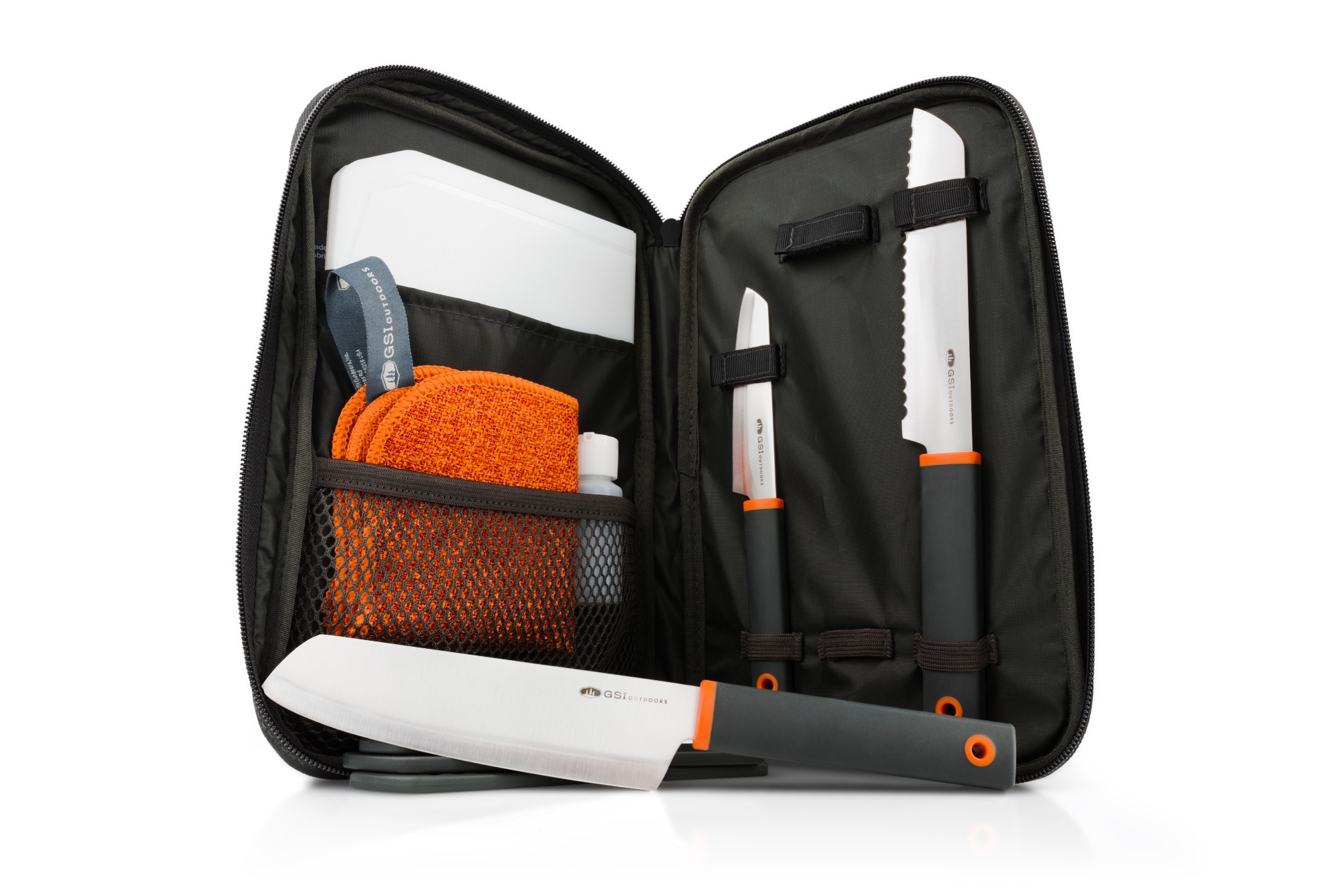 GSI Santoku Knife Set - Kompakt set med otroligt fina knivar, skärbräda, handduk och förvaringsväska. En kockkniv, en skalkniv och en brödkniv – alla tre med slida och gummerat ergonomiskt handtag. Vikt: 726g, Mått: 29,5 x 19,1 x 5,1cm
