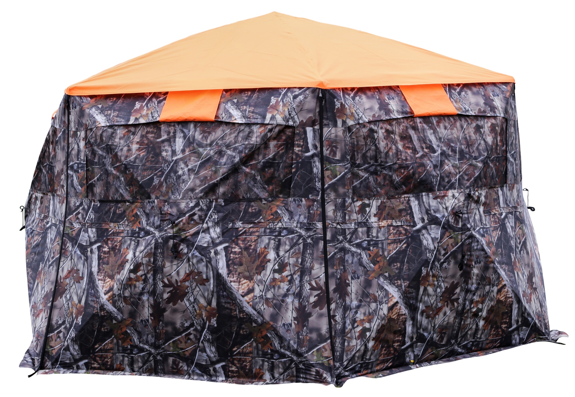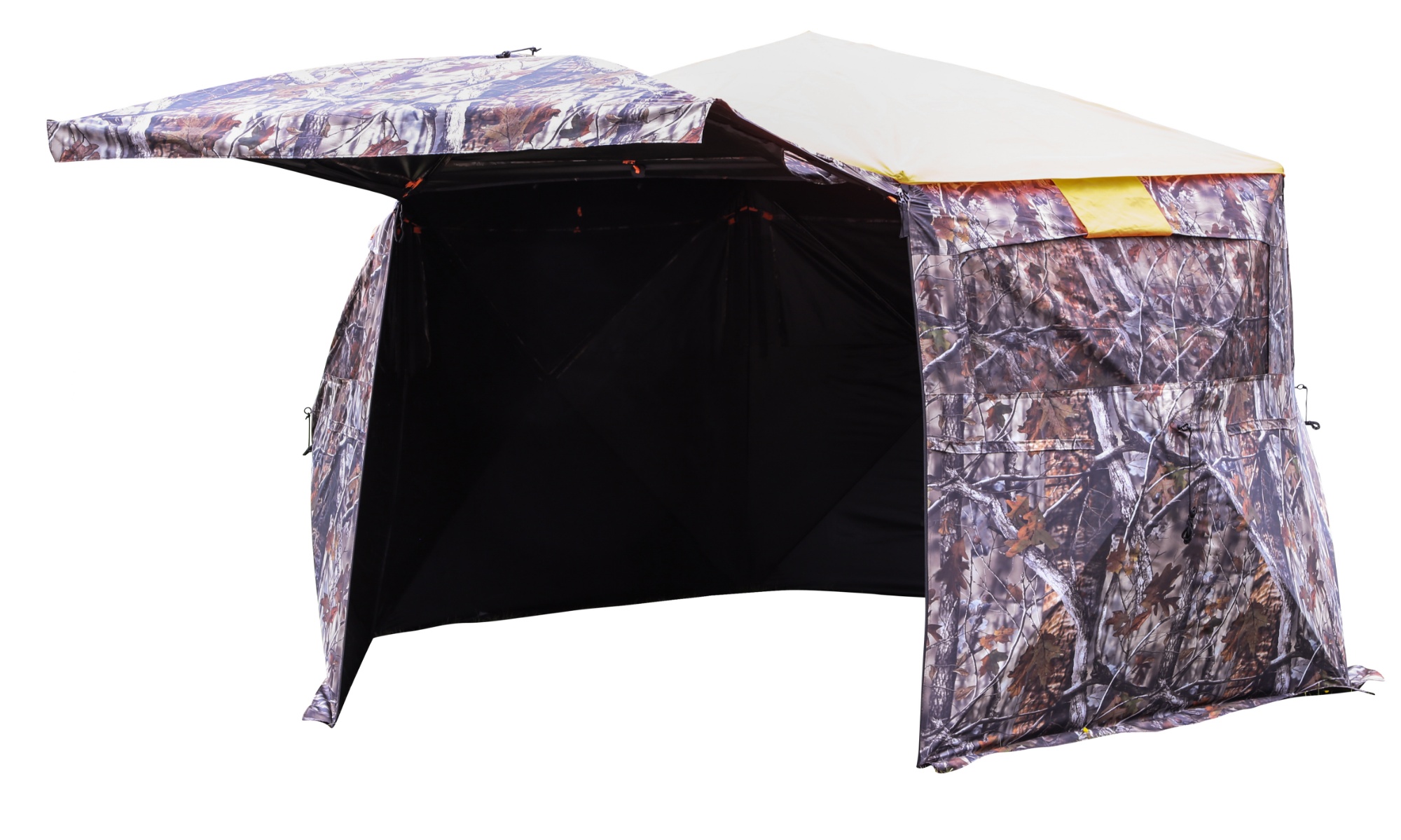 IFISH Skogskoja 6. Helt unikt tält / vindskydd som är enkelt att sätta upp. Genomtänkta detaljer gör att man kan antingen använda det som gömsle vid vakjakt, där fönstren och myggnäten ljudlöst kan dras ner. Eller så kan man använda det som vind och regnskydd på passet där den ena väggen kan öppnas upp och fungera som tak, med full ståhöjd om så önskas. Den öppningsbara delen kan även vikas in i tältet. Tack vare den extra stora golvytan (7,3 M²) kan tältet användas som samlingsplats för mindre jaktsällskap – perfekt vid sämre väder. Orange tak (regnskydd), Teleskopiska stöttor, Tältpinnar och Stormlinor medföljer.