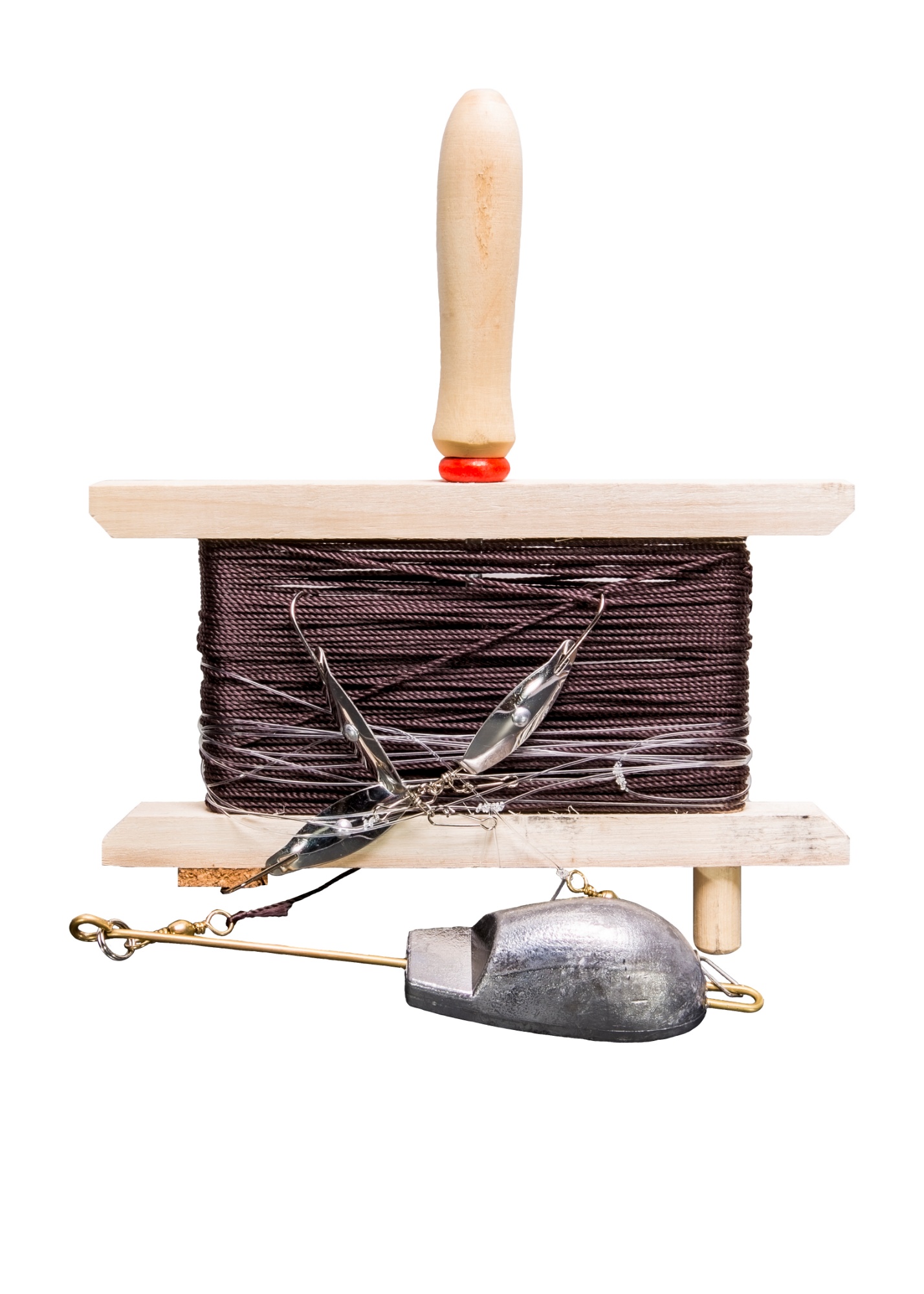 IFISH Släpdörj. Komplett släpdörj på trävinda med spunnen lina, sänke av zink och blänken. Används som handredskap för makrillfiske från båt.