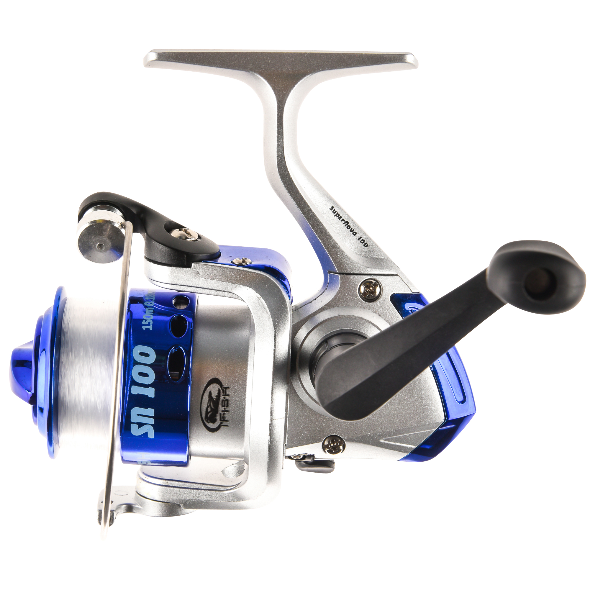 IFISH SN 100. Kullagrad lätt haspelrulle som levereras med påspolad nylonlina. Veven kan ändras från vänster till höger sida. Utväxling 5.2:1. Linkapacitet 150 meter 0,20mm. Vikt 143g