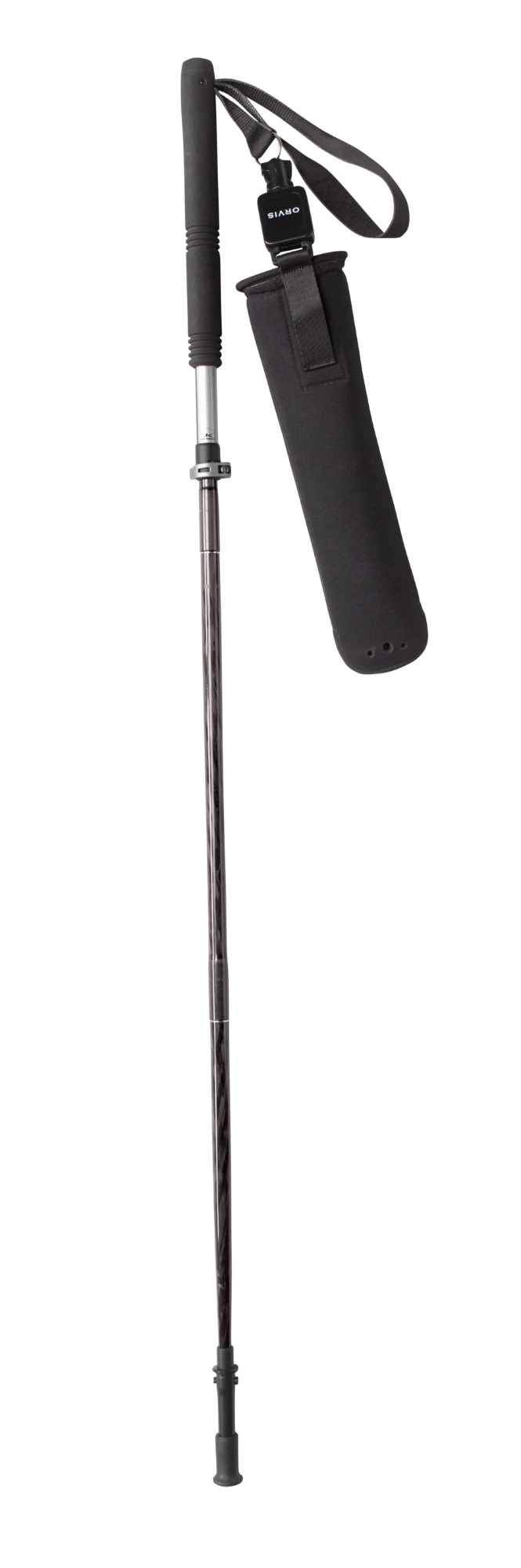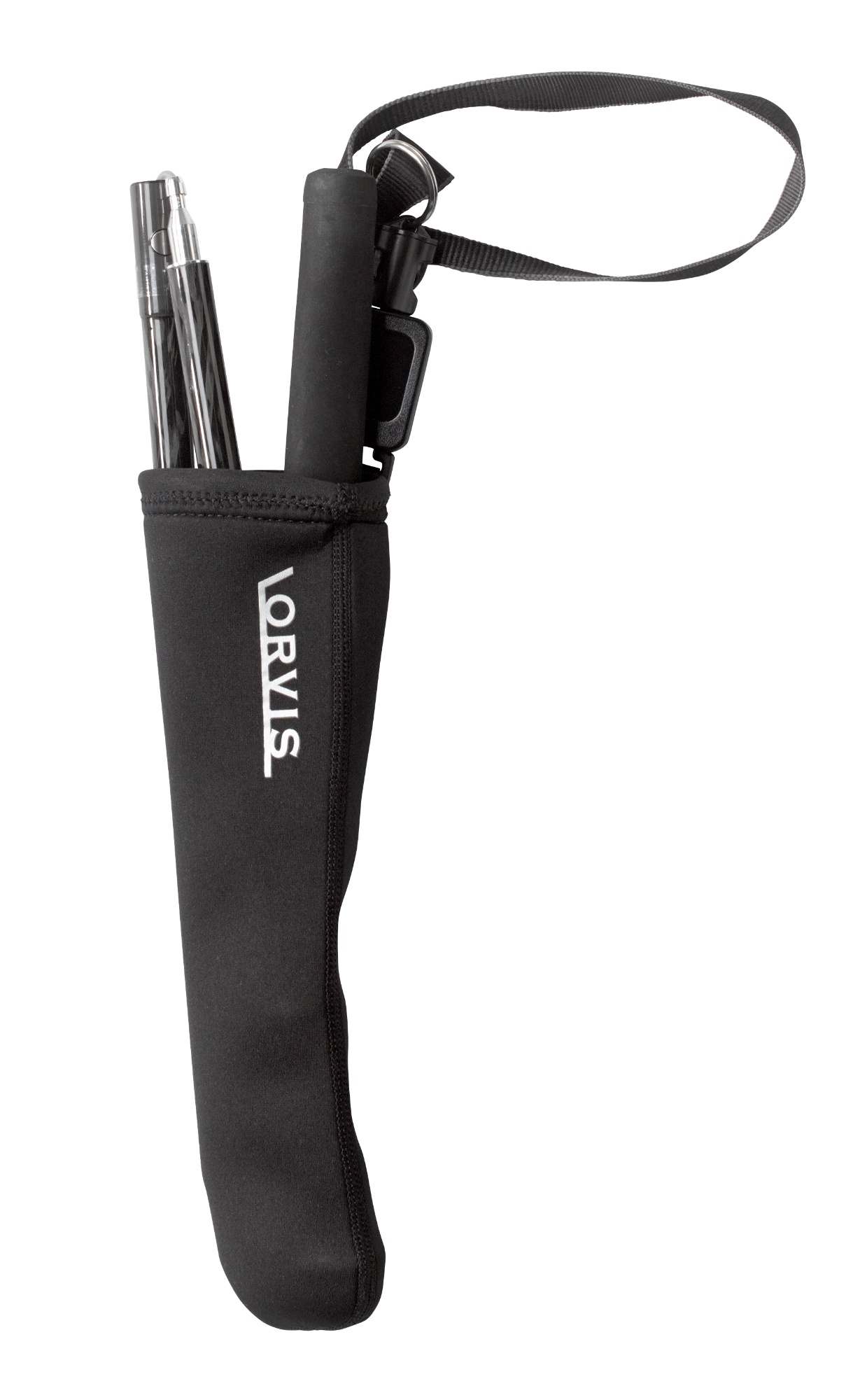 Orvis Wading Staff. Justerbar, lätt, stark kolfiberstav med aluminiumdetaljer, halkfritt grepp, hårdmetallspets, handledsrem och neoprenfodral med fäste för vadarbältet. Längd från 40cm (hopskjuten) till 103cm-133cm (teleskopisk)